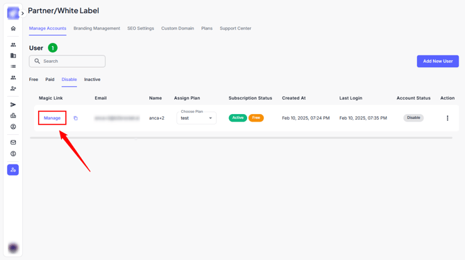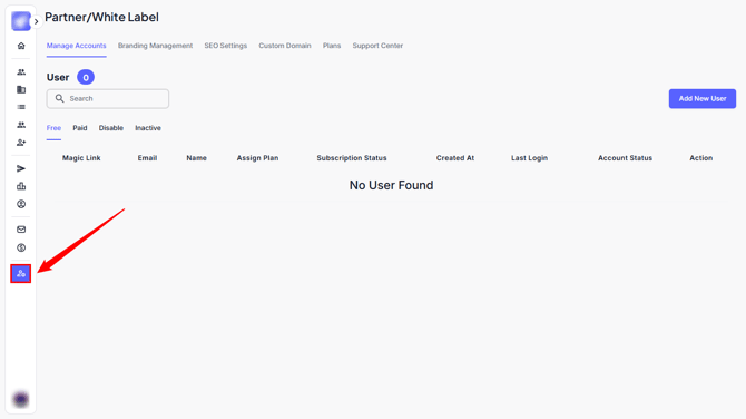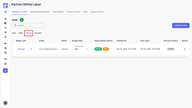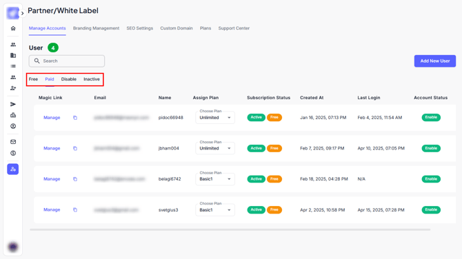 From here, you can view and manage all users under your White Label setup.