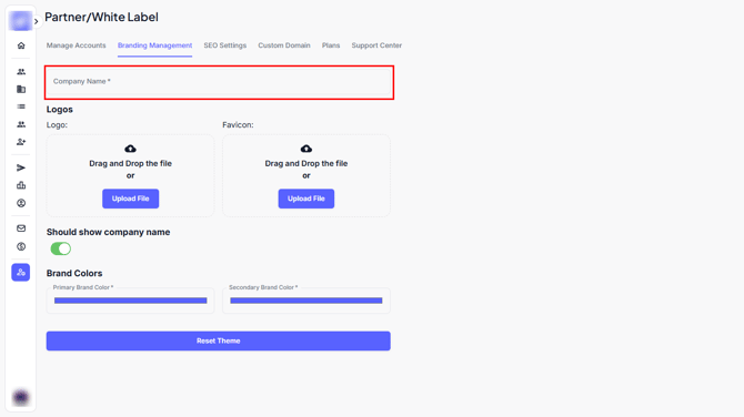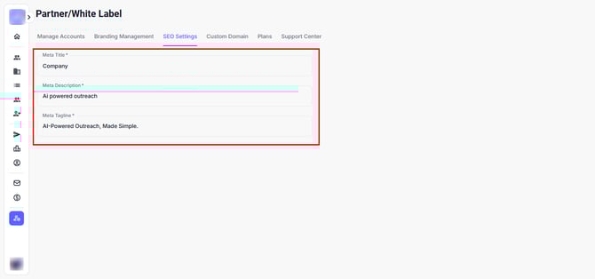 Under the SEO tab, you can set how your White Label platform appears in search engines or browser tabs: