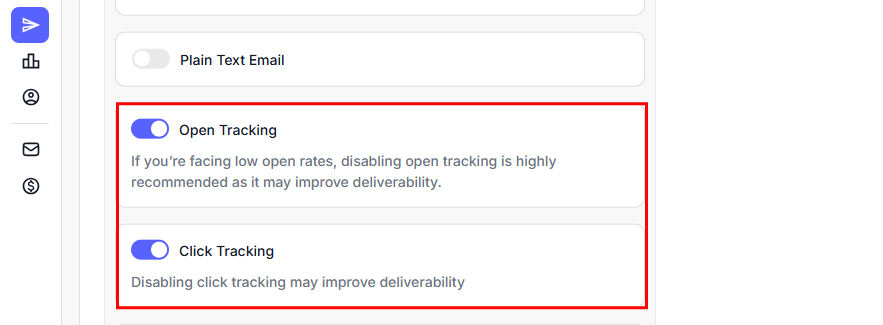 A: If Open or Click Tracking was turned off at the time of sending, the system won’t collect any data. Make sure both tracking options are enabled before launching the campaign. They can’t be applied retroactively.